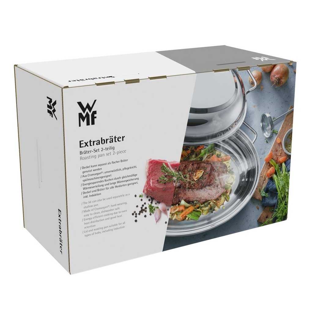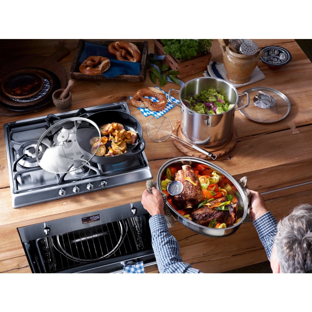 Ovalna posuda za pečenje s poklopcem od nehrđajućeg čelika dvostruke namjene tradicionalnog njemačkog proizvođača WMF idealna je za kuhanje, prženje, pečenje i pirjanje mesa, ribe i povrća. U velikom plehu možete jednostavno pripremiti ukusno pečenje za cijelu obitelj ili veliku pečenu gusku sa zlatnom koricom. Površina će biti savršeno hrskava, dok će meso iznutra ostati podatno i sočno. Posuda za pečenje je savršena za korištenje u pećnici. Višenamjenski poklopac, koji se može koristiti kao tava, bit će cijenjen prilikom pirjanja na štednjaku. Poput posude za pečenje, poklopac je opremljen univerzalnim dnom Trans Therm®.