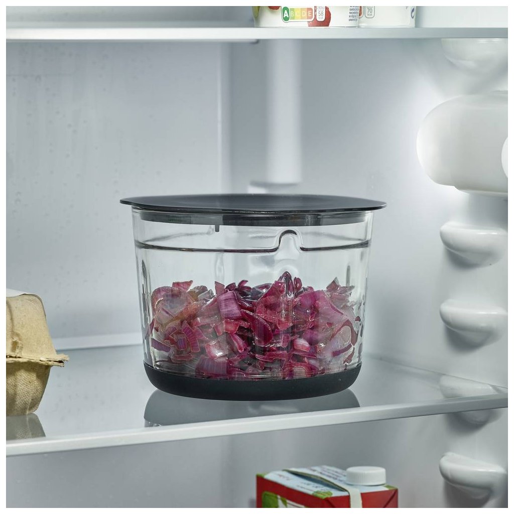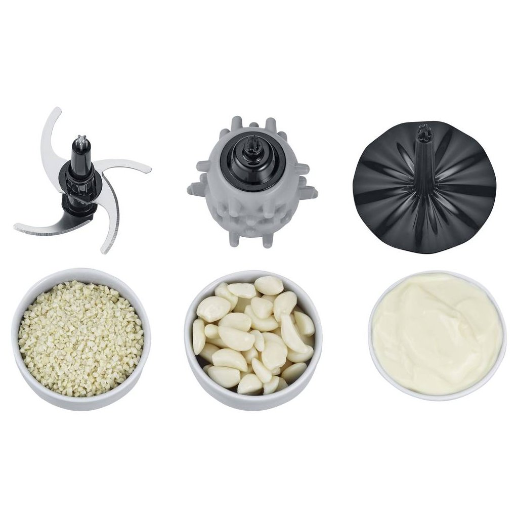 - pogodan za sjeckanje začinskog bilja, luka, mesa, sira, orašastih plodova, drobljenje leda, pripremu kreme, kreme itd.