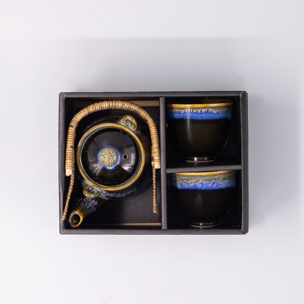 - Čajni set BLACK BRIGHT BLUE stvara upečatljiv vizualni element na stolu zahvaljujući kontrastu duboke crne glazure i bogatog plavog efekta kapanja.