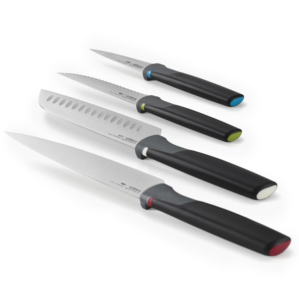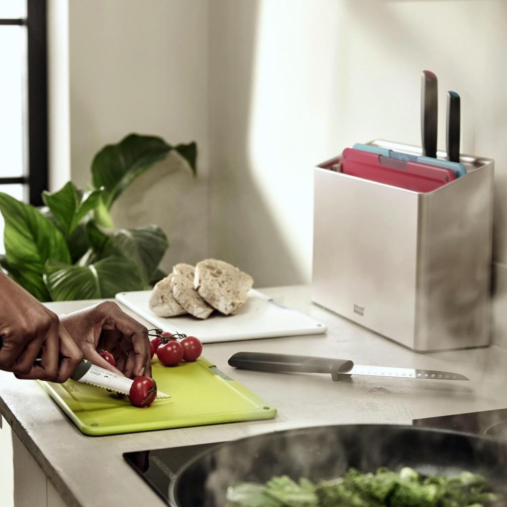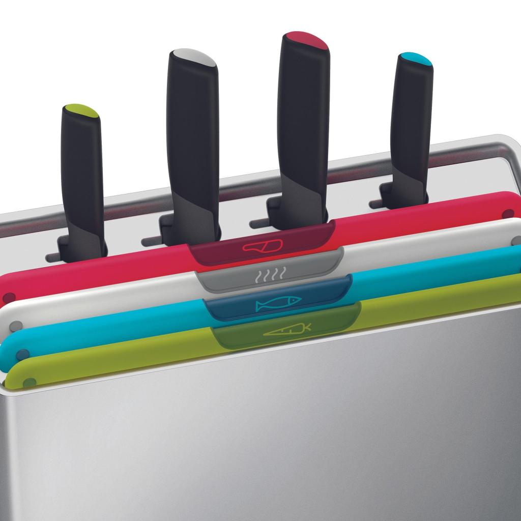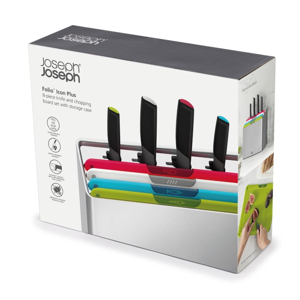 - Joseph Joseph FOLIO ICON PLUS set kombinira 4 daske za rezanje i 4 kuhinjska noža u kompaktnom stalku, tako da imate sve potrebno za pripremu hrane pregledno spremljeno na jednom mjestu.