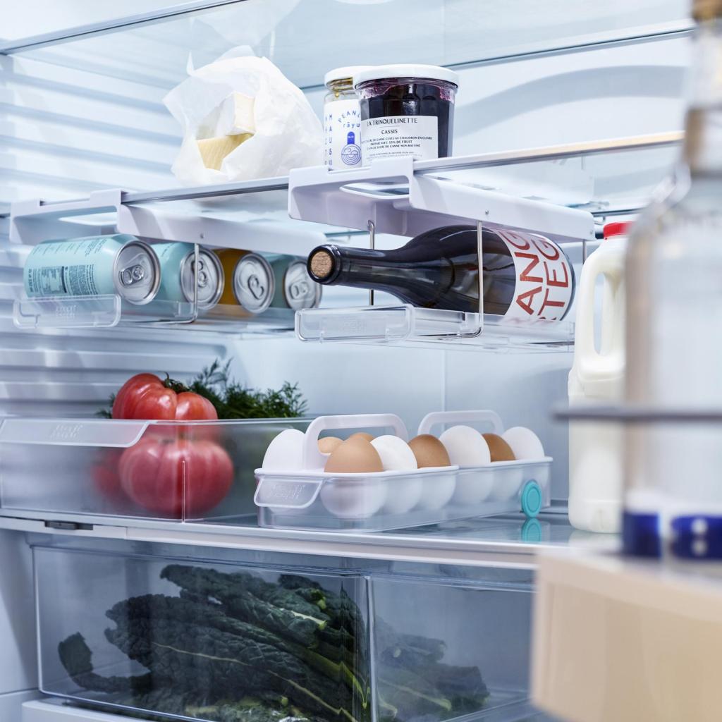 - Držač se lako i čvrsto pričvršćuje izravno ispod police hladnjaka, čime se koristi dosad neiskorišteni prostor i pomaže u održavanju savršeno organiziranog interijera hladnjaka.