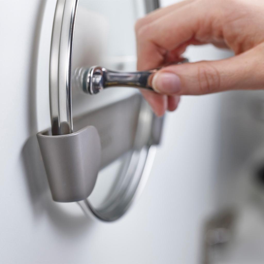 - Držači omogućuju brz pristup poklopcima tijekom kuhanja, bez potrebe da ih tražite u pretrpanom ormariću.