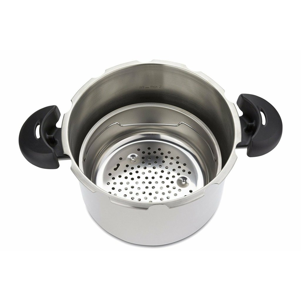 Lonac se lako otvara i zatvara samo jednom rukom. Troslojno dno sendviča s unutarnjom aluminijskom jezgrom osigurava savršenu raspodjelu topline, a sigurnosni sustav u pet stupnjeva jamči izuzetno sigurno kuhanje pod pritiskom. Paket također uključuje košaru na paru. Osim toga, proizvođač daje 10-godišnje jamstvoza samu posudu.