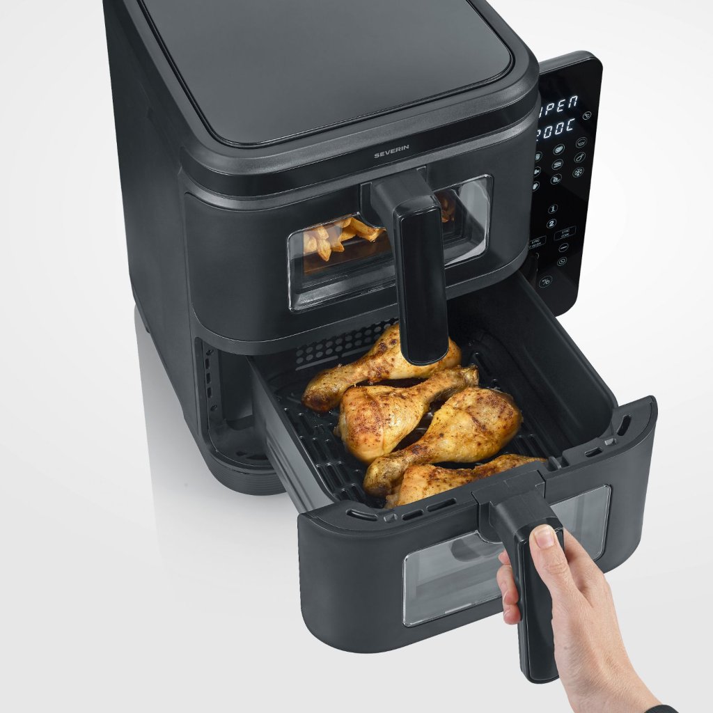 - friteza na vrući zrak Severin FR 2468 s dvostrukim rasporedom nudi zdravo kuhanje bez ulja u kompaktnom i snažnom dizajnu