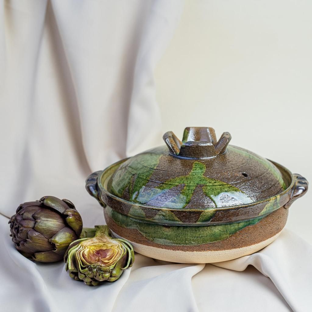 - Keramička lonac DONABE posuda kapaciteta 4 litre u zelenkastosmeđem dizajnu donosi tradicionalni japanski način kuhanja i, zahvaljujući svom prepoznatljivom obliku i ručno izrađenoj glazuri, djeluje kao dominantan element blagovaonskog stola.