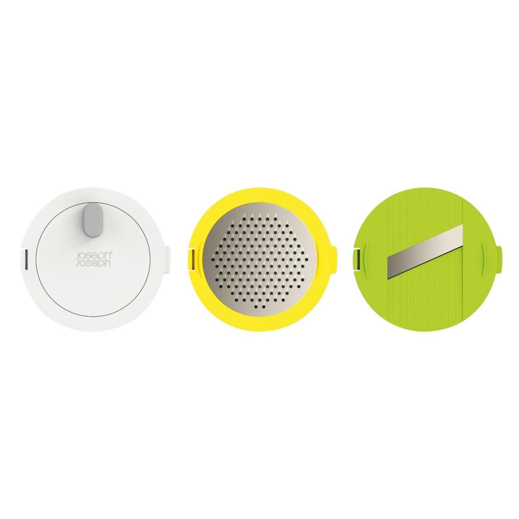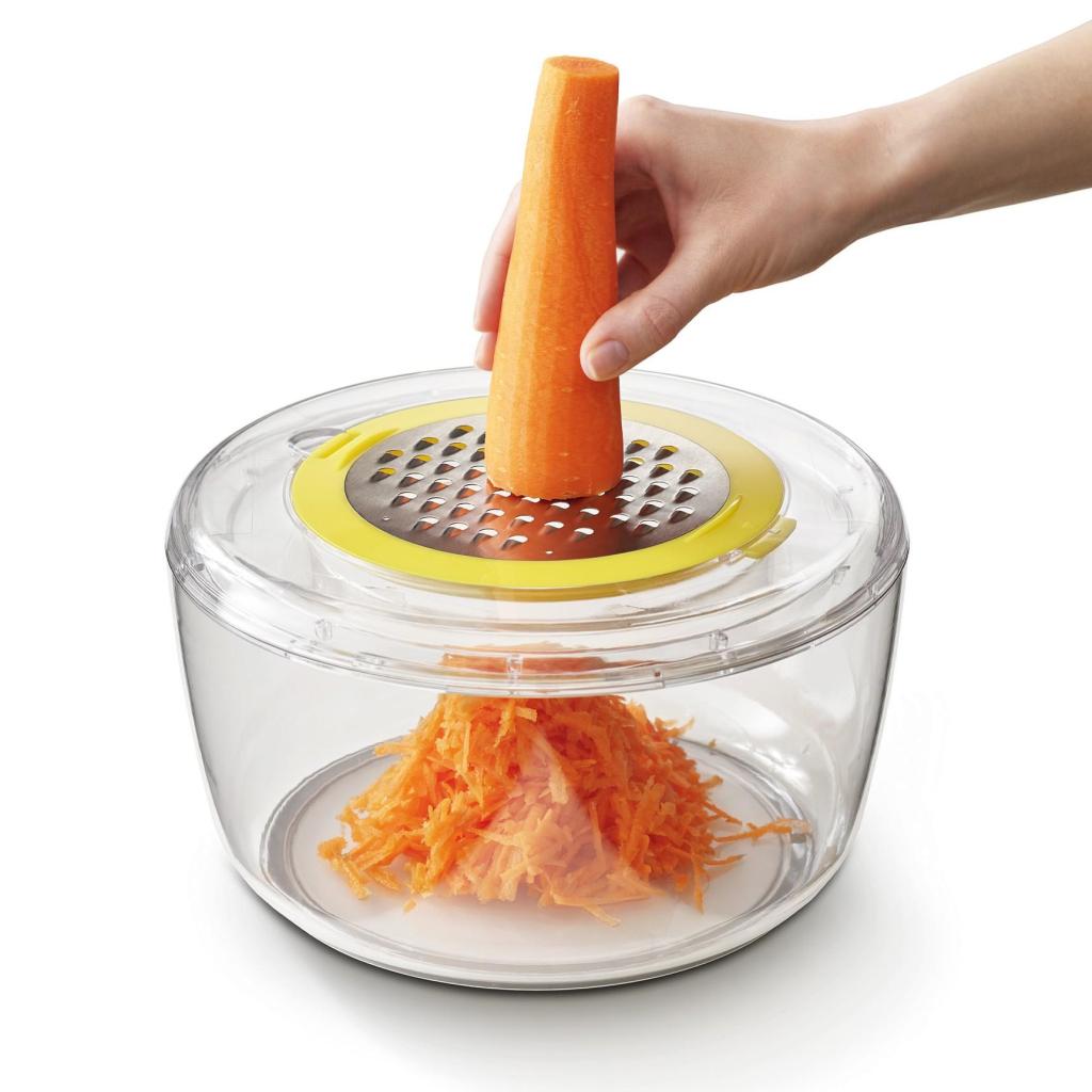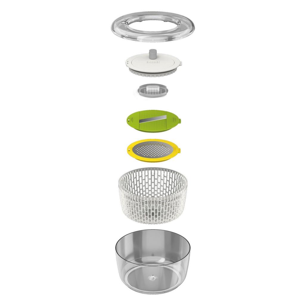 - Nakon sušenja, središnji disk u poklopcu se lako može ukloniti i zamijeniti nastavkom za rezanje ili ribanje, prema potrebi.
