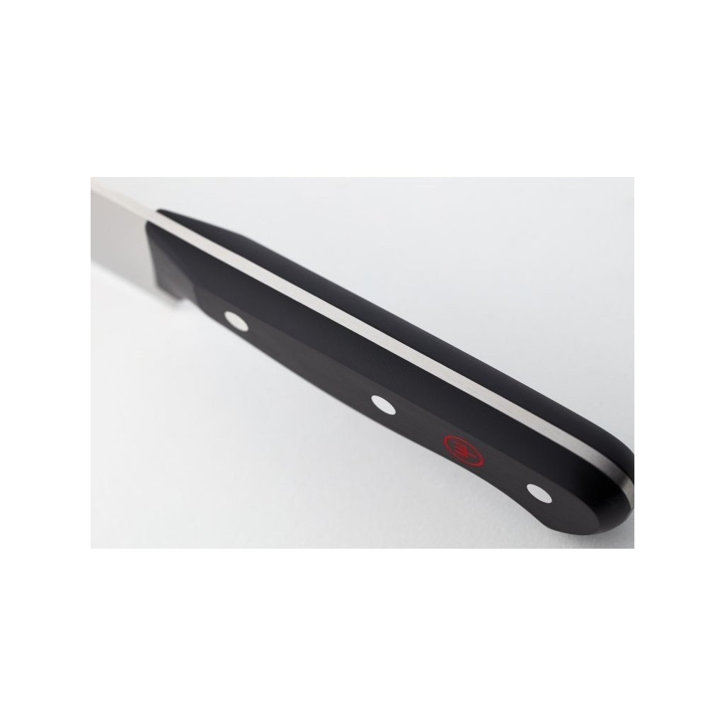 Ovaj nož od nehrđajućeg čelika prikladan je za savršeno rezanje kobasica, govedine i jednostavno rezanje voća i povrća. Nož je dio Gourmet linije u kojoj možete pronaći nekovane noževe brušen posebnom tehnologijom koja jamči izuzetnu oštrinu noževa. Oblikovane ručke izrađene su od sintetike i nema razmaka između ručke i čelika iz higijenskih razloga, spoj je zakovicama. Noževi su savršeno izbalansirani i udobno leže u ruci.