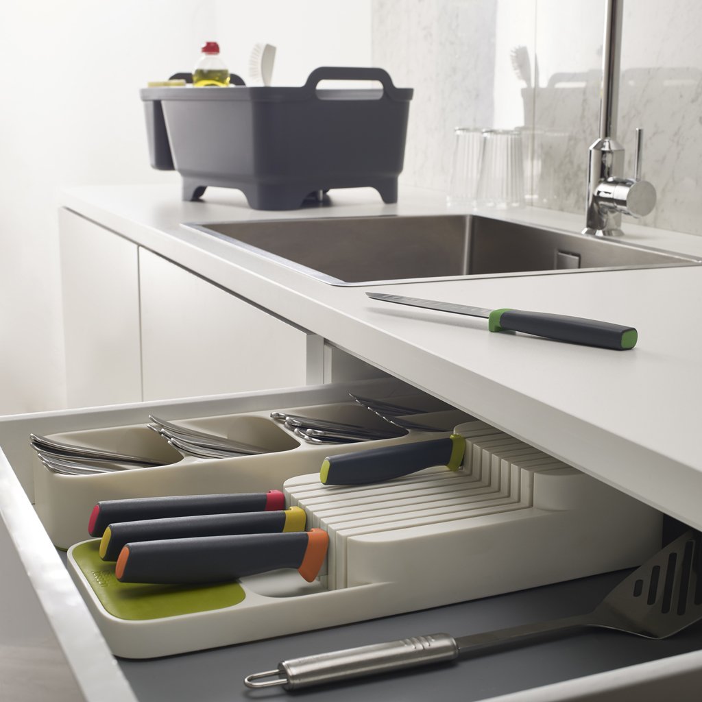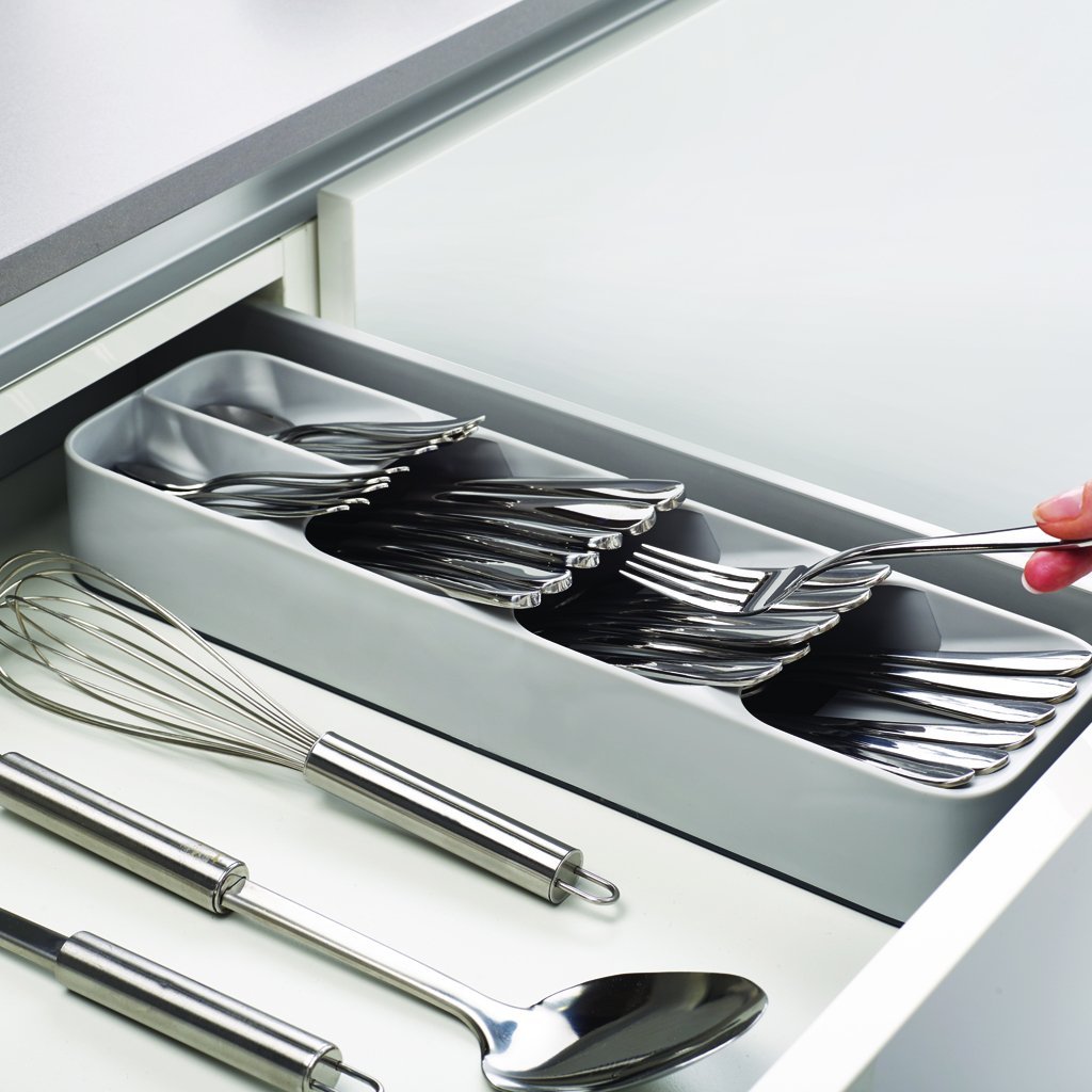 Pohranjivanje pribora za jelo pod kutom jednog iznad drugog u komodi JOSEPH JOSEPH DrawerStore štedi više od pola prostora u ladici. Pribor za jelo se može umetnuti u označene utore s obje strane. Protuklizne nogice osiguravaju stabilnost pretinaca u ladici. Organizator se može koristiti u ladici minimalne dubine 8 cm.