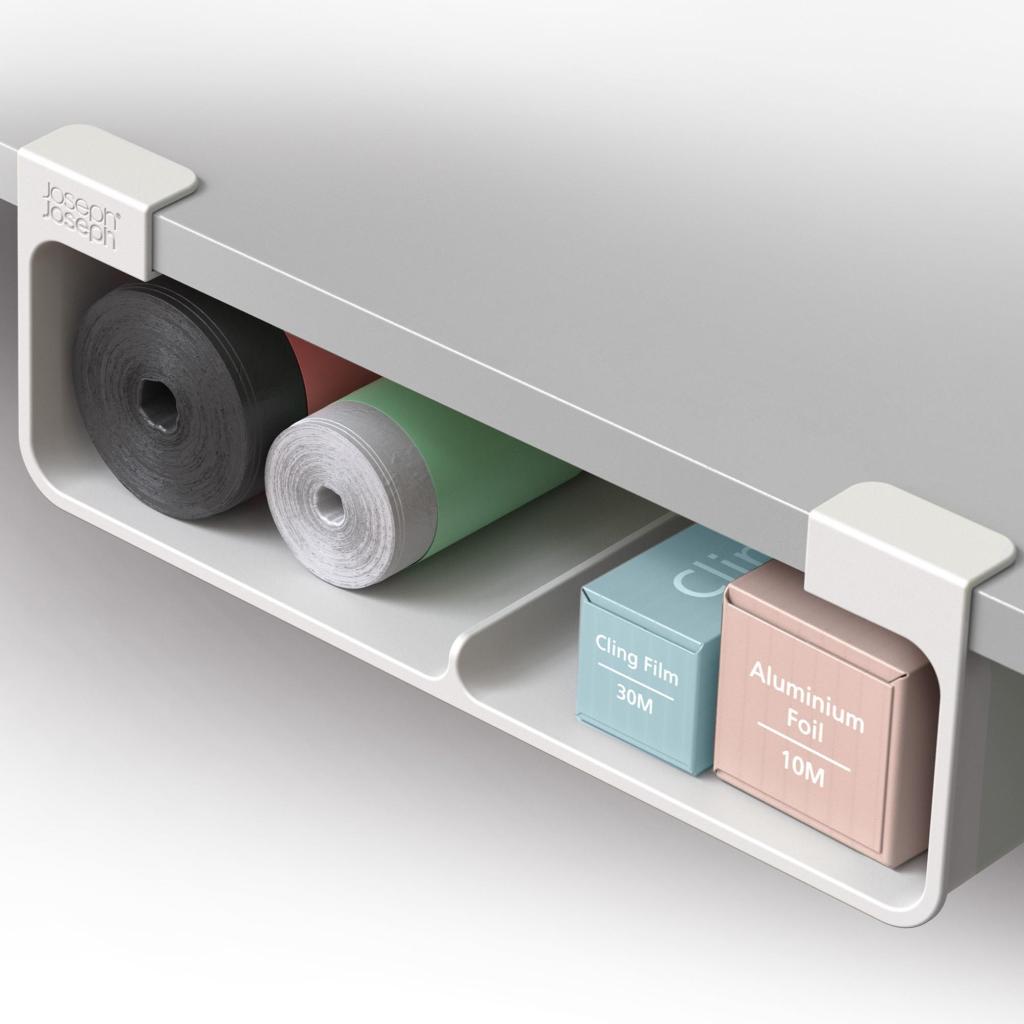 - Organizator Joseph Joseph CUPBOARDSTORE pomaže iskoristiti slobodan prostor ispod police kuhinjskog ormarića i stvara praktično mjesto za pohranu kuhinjskih folija, aluminijske folije ili vrećica.