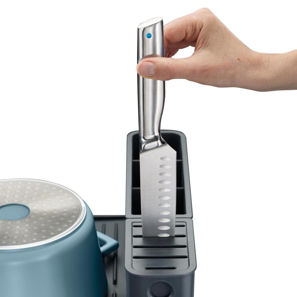 - Uklonjivi ocjeđivač pribora za jelo može se postaviti po potrebi i također uključuje utore za sigurno spremanje noževa.
