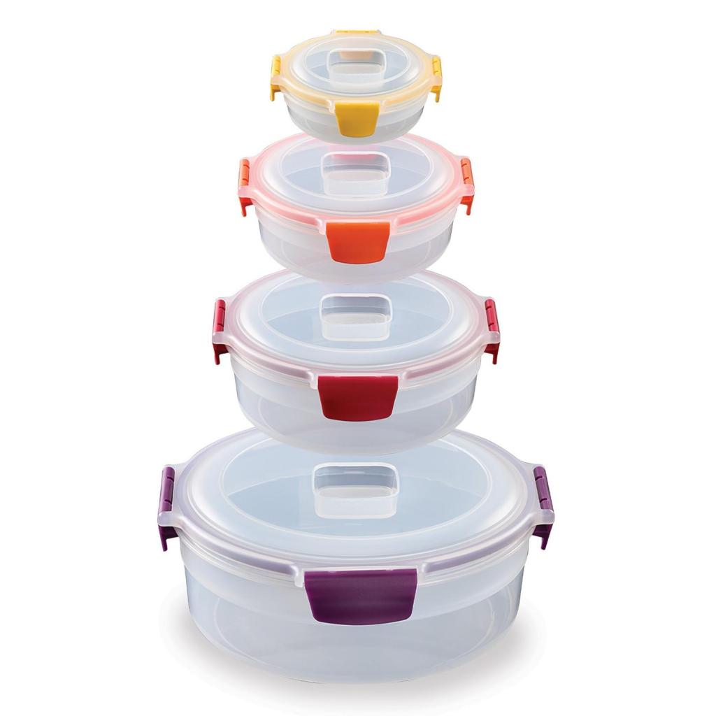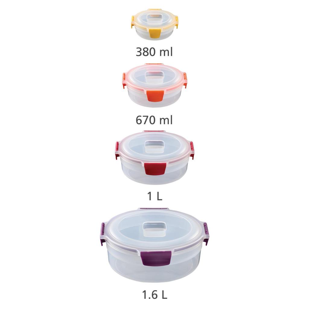 - Komplet sadrži četiri okrugle posude zapremine 380 ml, 670 ml, 1 litru i 1,6 litre s odgovarajućim poklopcima, koje pokrivaju širok spektar potreba.