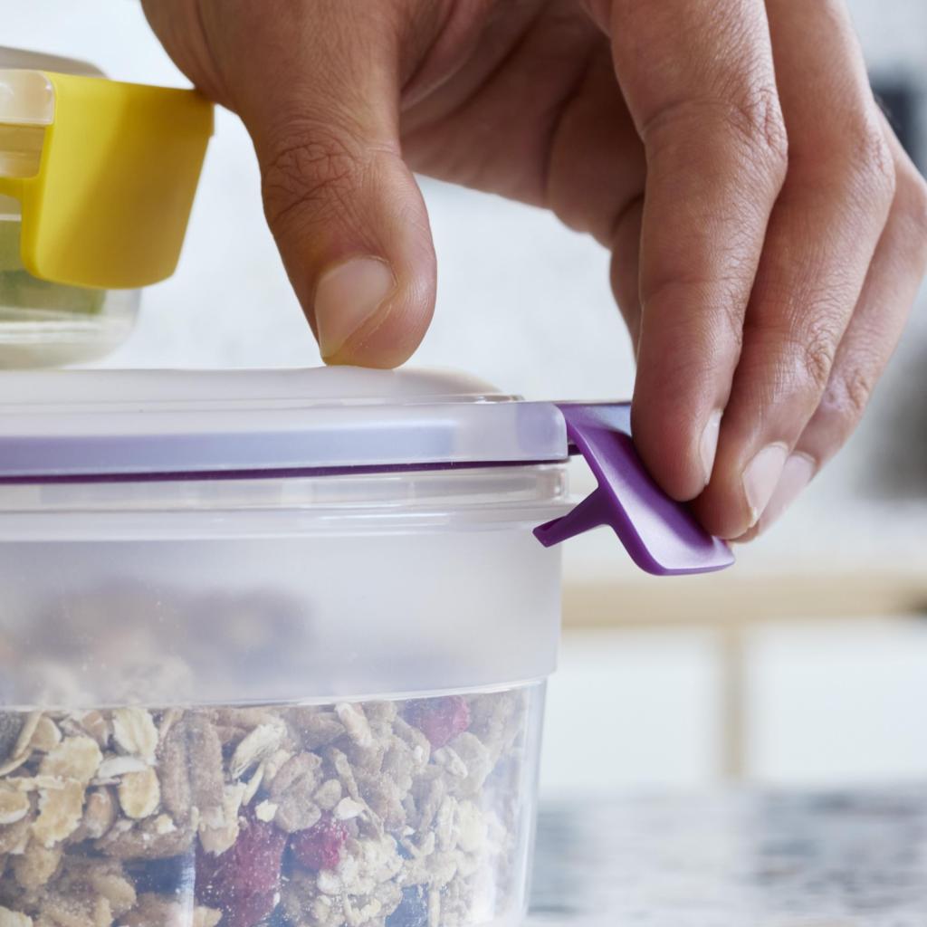 - Složivi poklopci čvrsto drže na mjestu i prilikom spremanja napunjenih posuda jedne na drugu, čime hladnjak ostaje pregledan i prostor se koristi učinkovito.