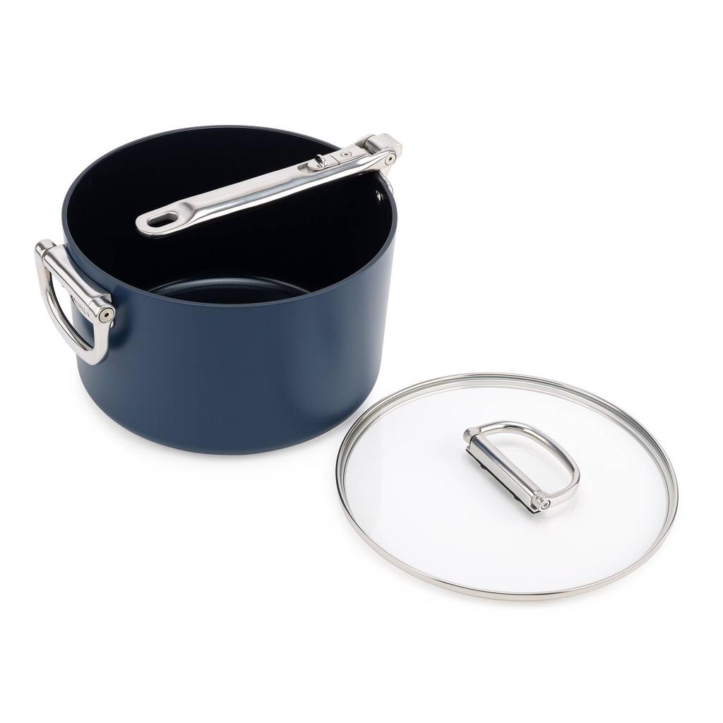 - Uključuje kaljeno staklo poklopac za lonac s rubom od nehrđajućeg čelika i sklopivu ručku od nehrđajućeg čelika za još ekonomičnije skladištenje.