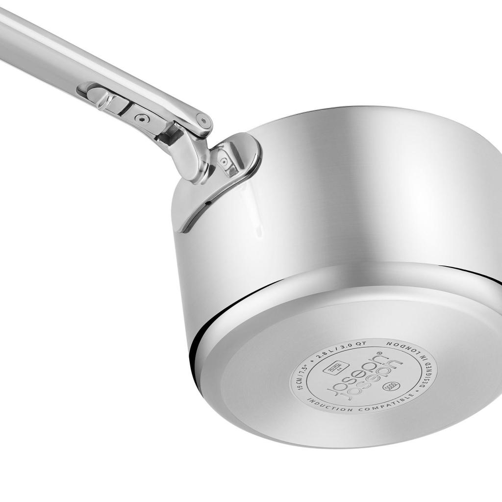- Robusna troslojna konstrukcija kombinira vanjski sloj od poliranog nehrđajućeg čelika, aluminijsku jezgru za ravnomjernu raspodjelu topline i unutarnji sloj od nehrđajućeg čelika.