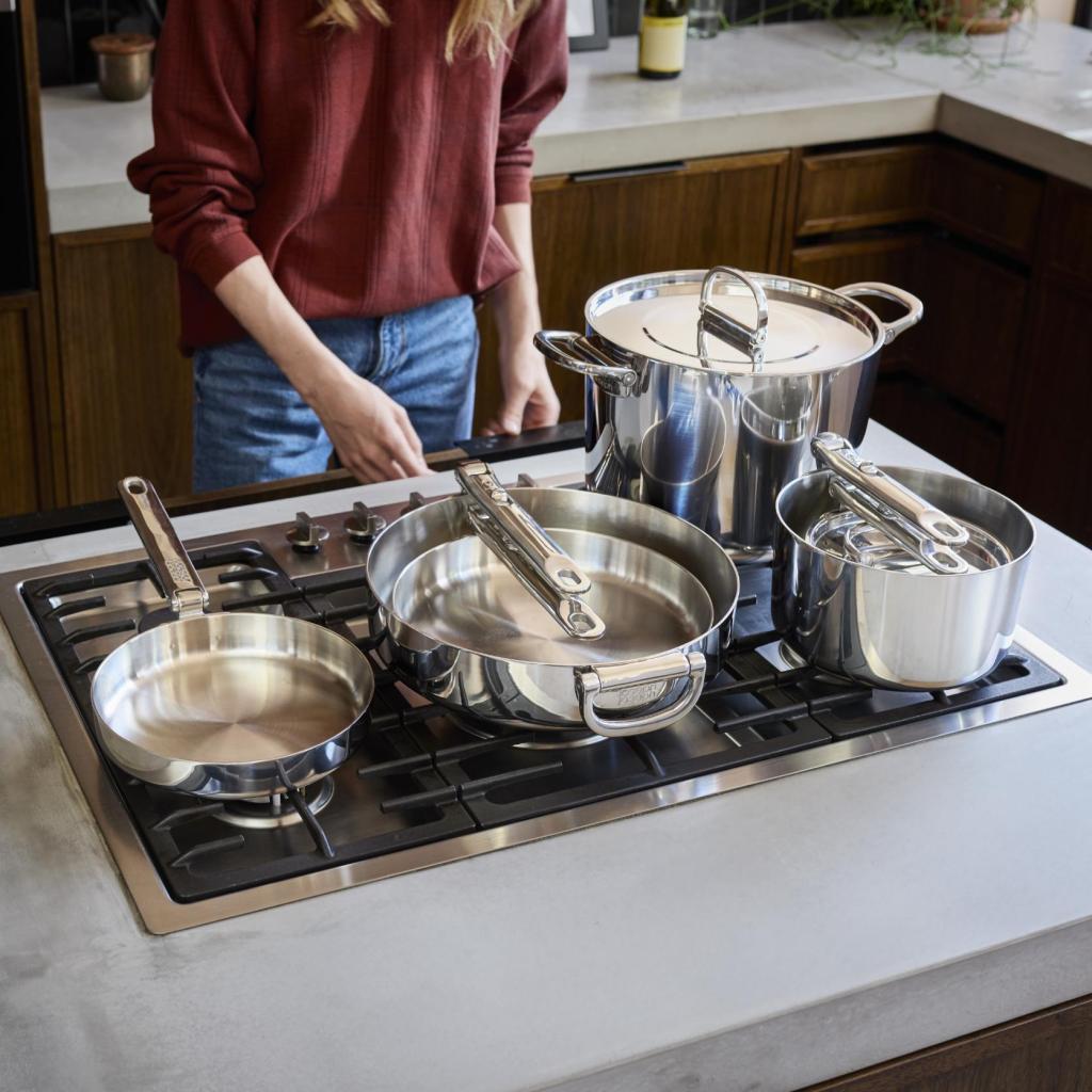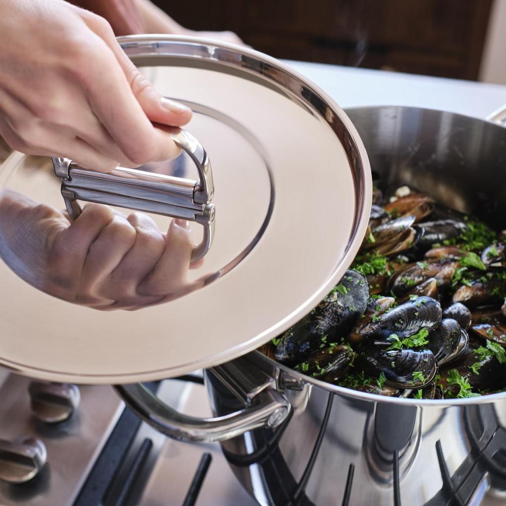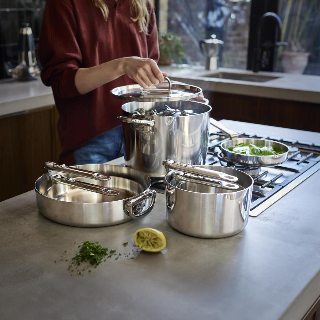 - Robusna troslojna konstrukcija kombinira vanjski sloj od poliranog nehrđajućeg čelika, aluminijsku jezgru za ravnomjernu raspodjelu topline i unutarnji sloj od nehrđajućeg čelika.