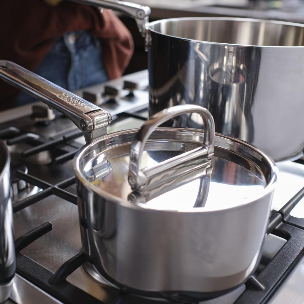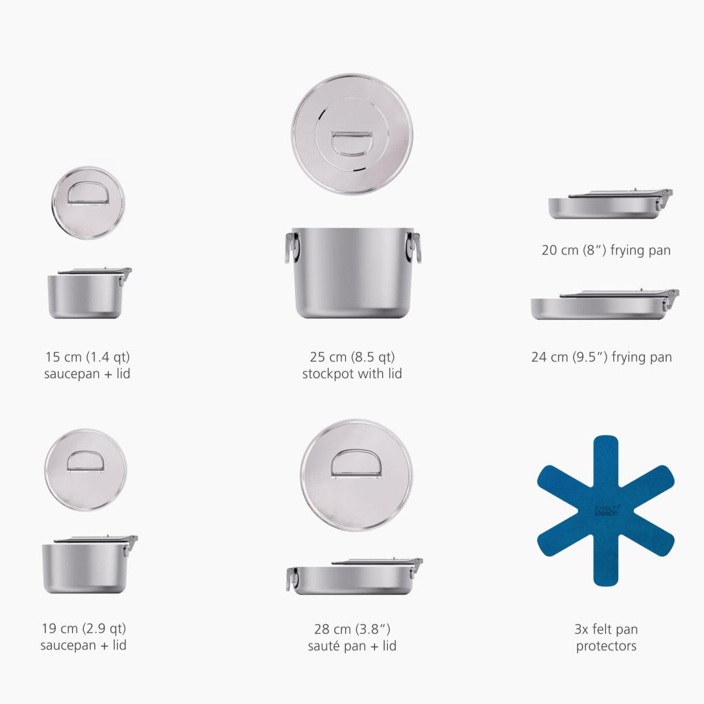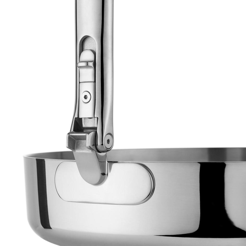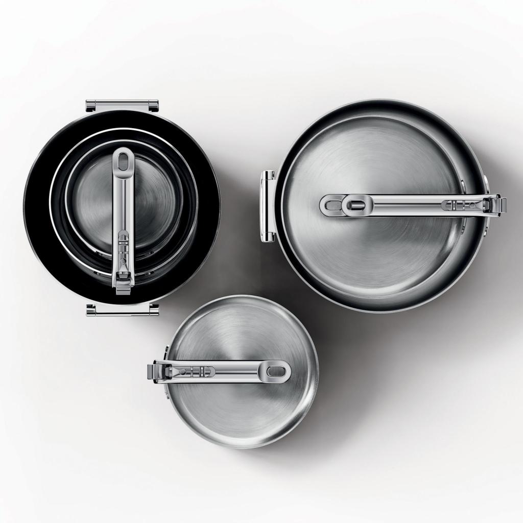 - Kompaktni dizajn slaganja omogućuje umetanje pojedinačnih lonaca i tava jedan u drugi, dok sklopive ručke značajno smanjuju potrebe za prostorom za pohranu do 50%.